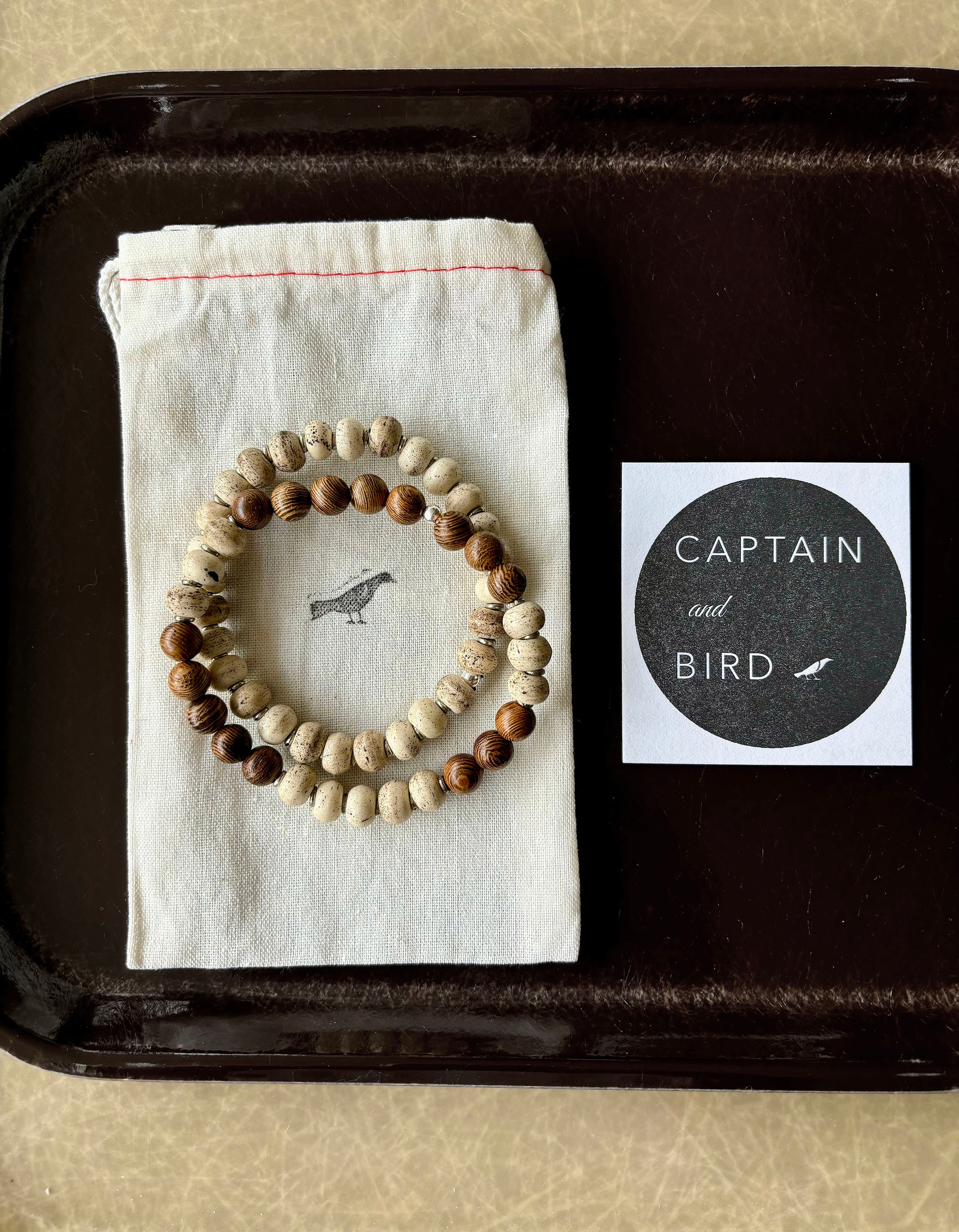 Men's trio of handmade boho beaded bracelets comprised of natural horn, bone and brass beads/findings along with Czech made rosary beads.