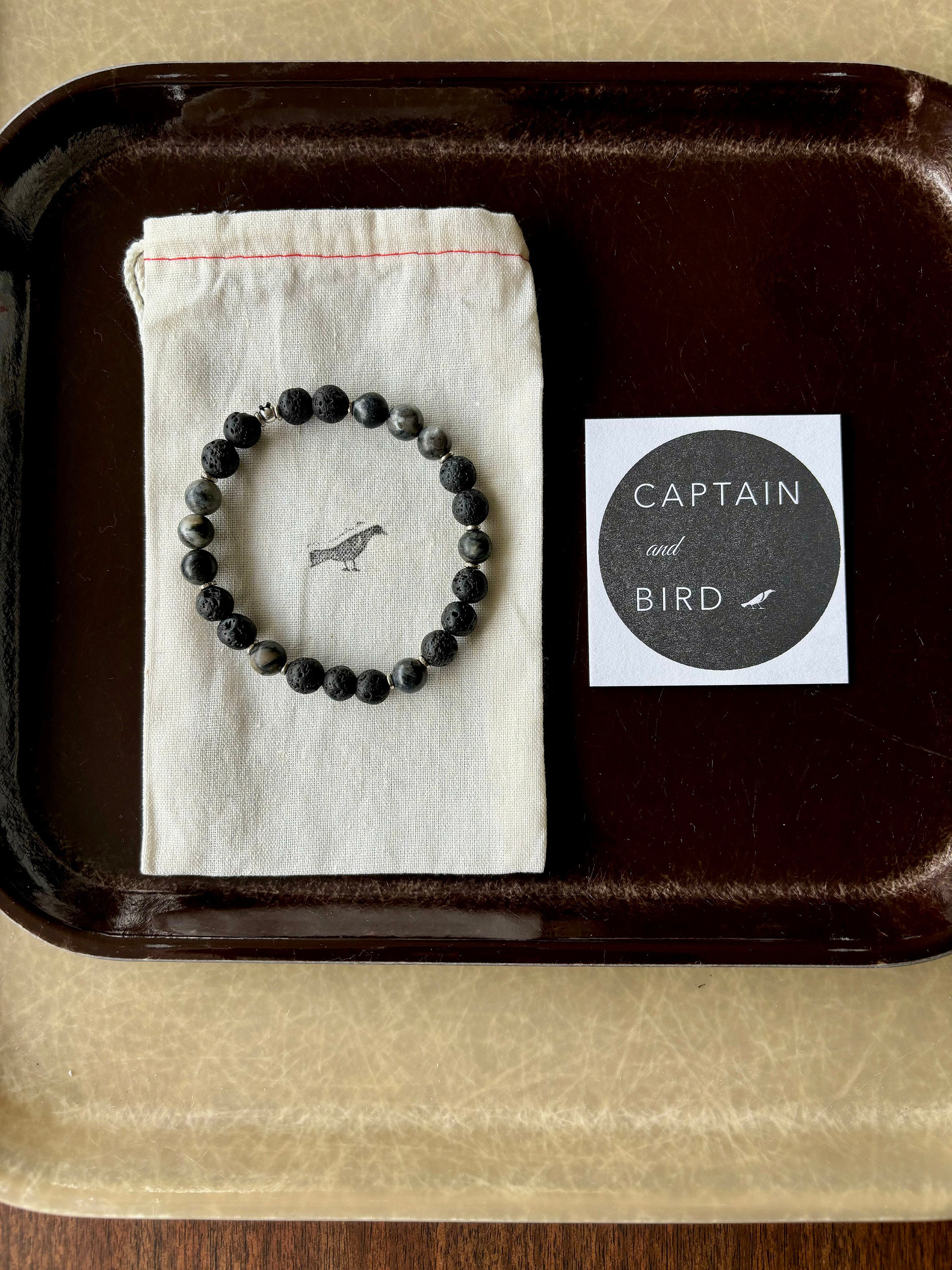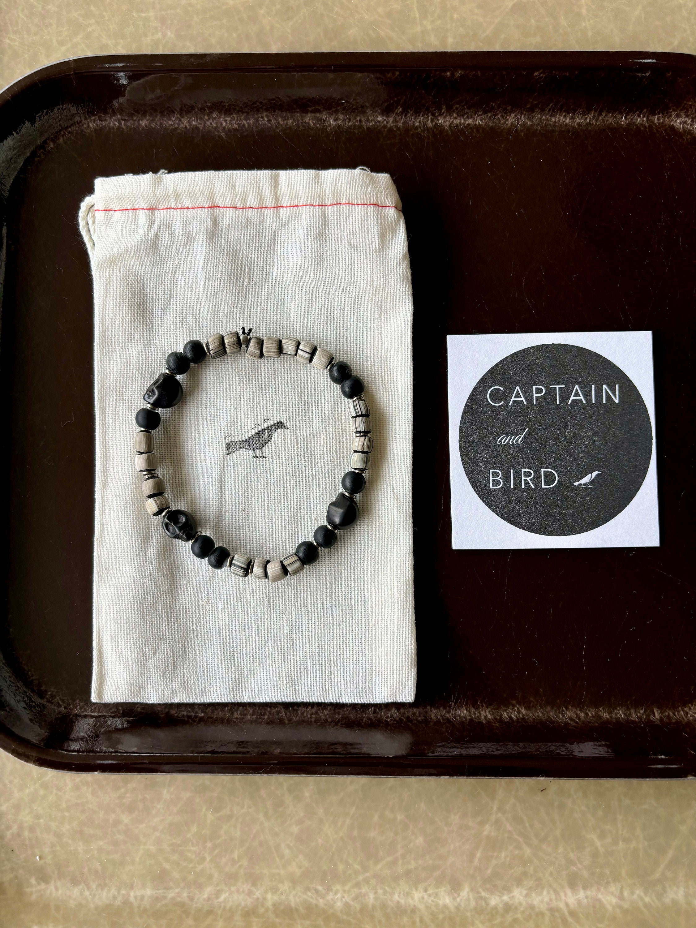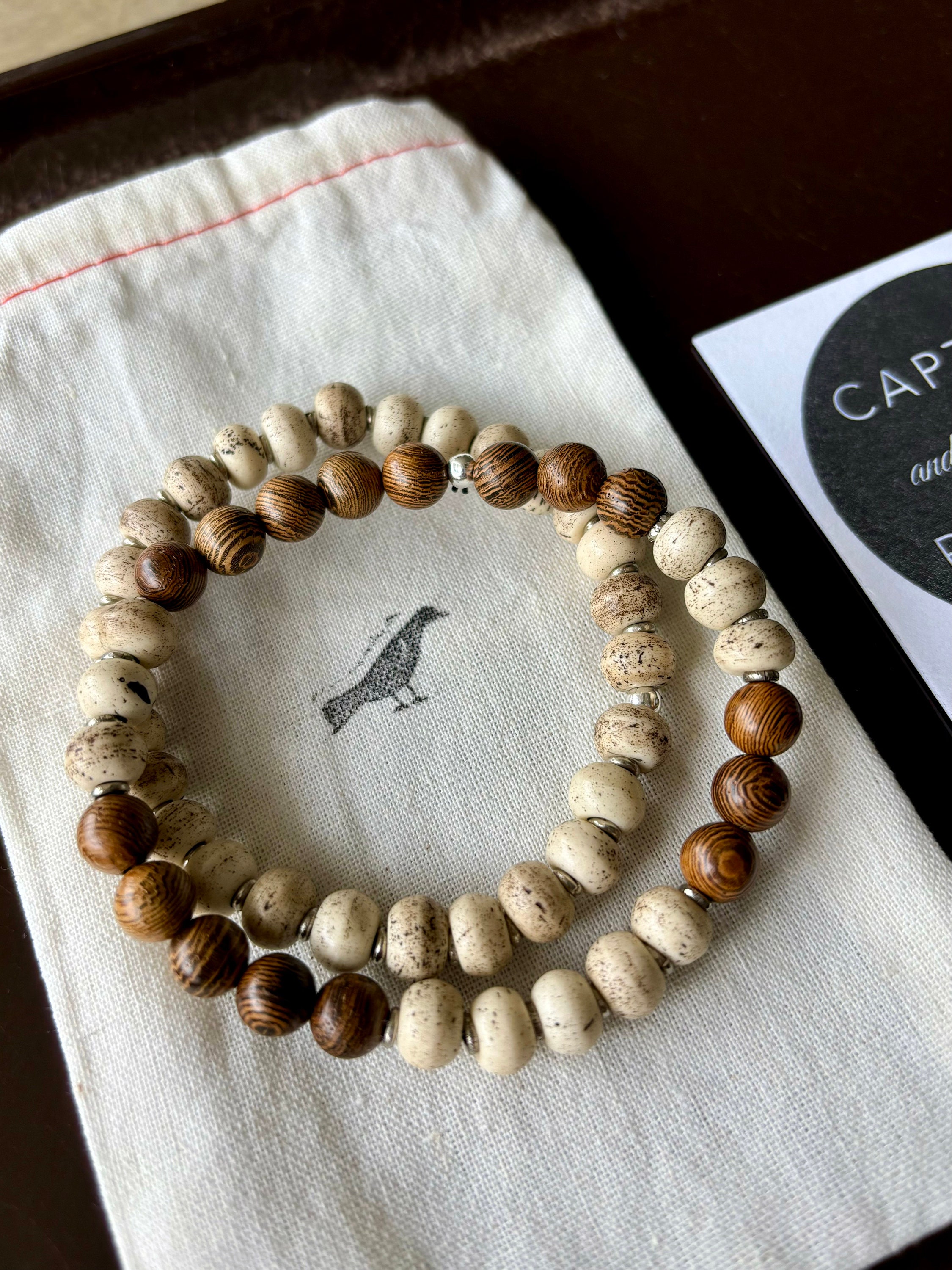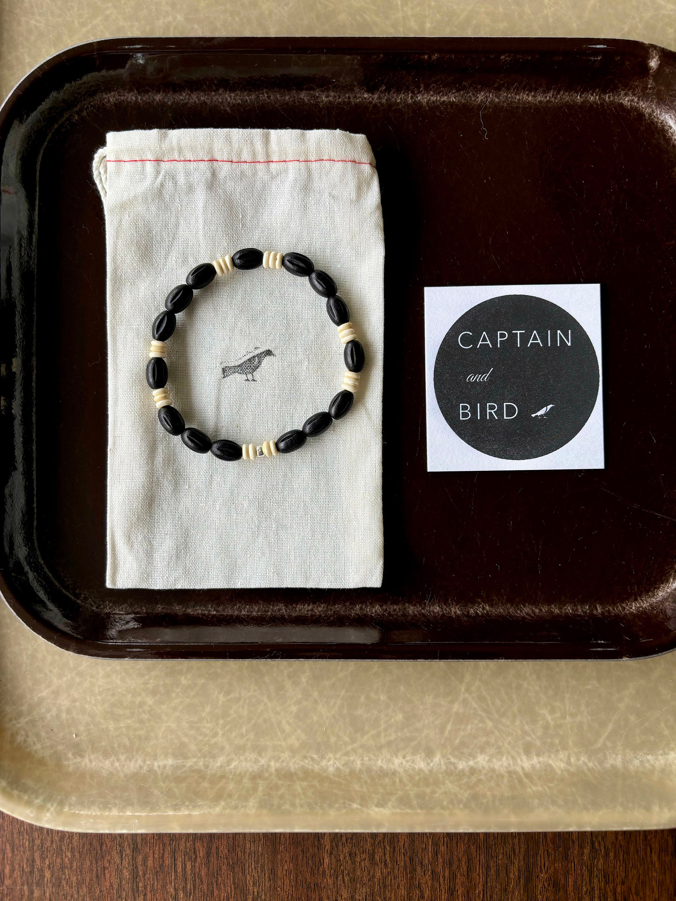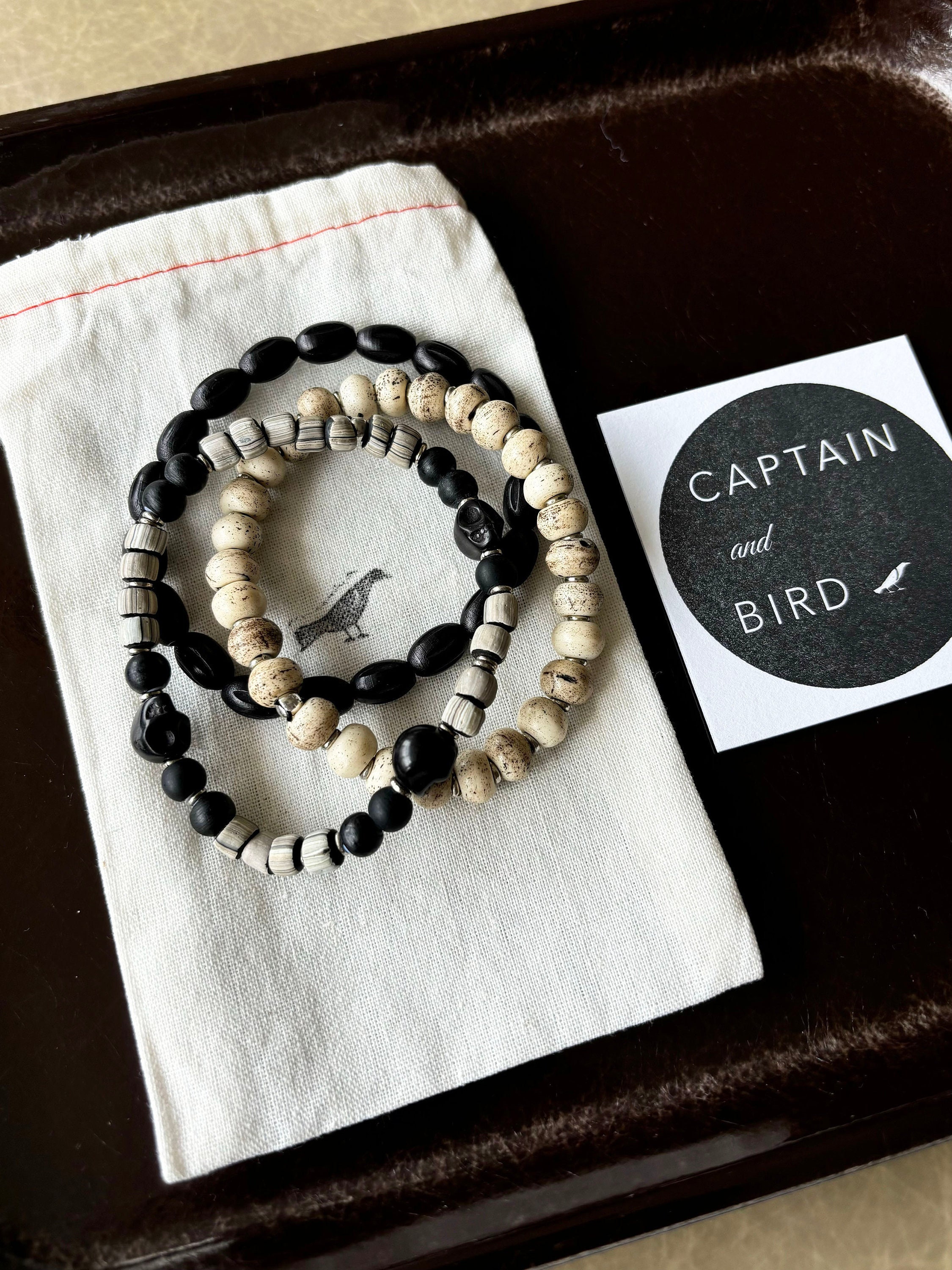 Men's selection of handmade boho beaded bracelets comprised of natural horn, bone and brass beads/findings along with Czech made rosary beads.