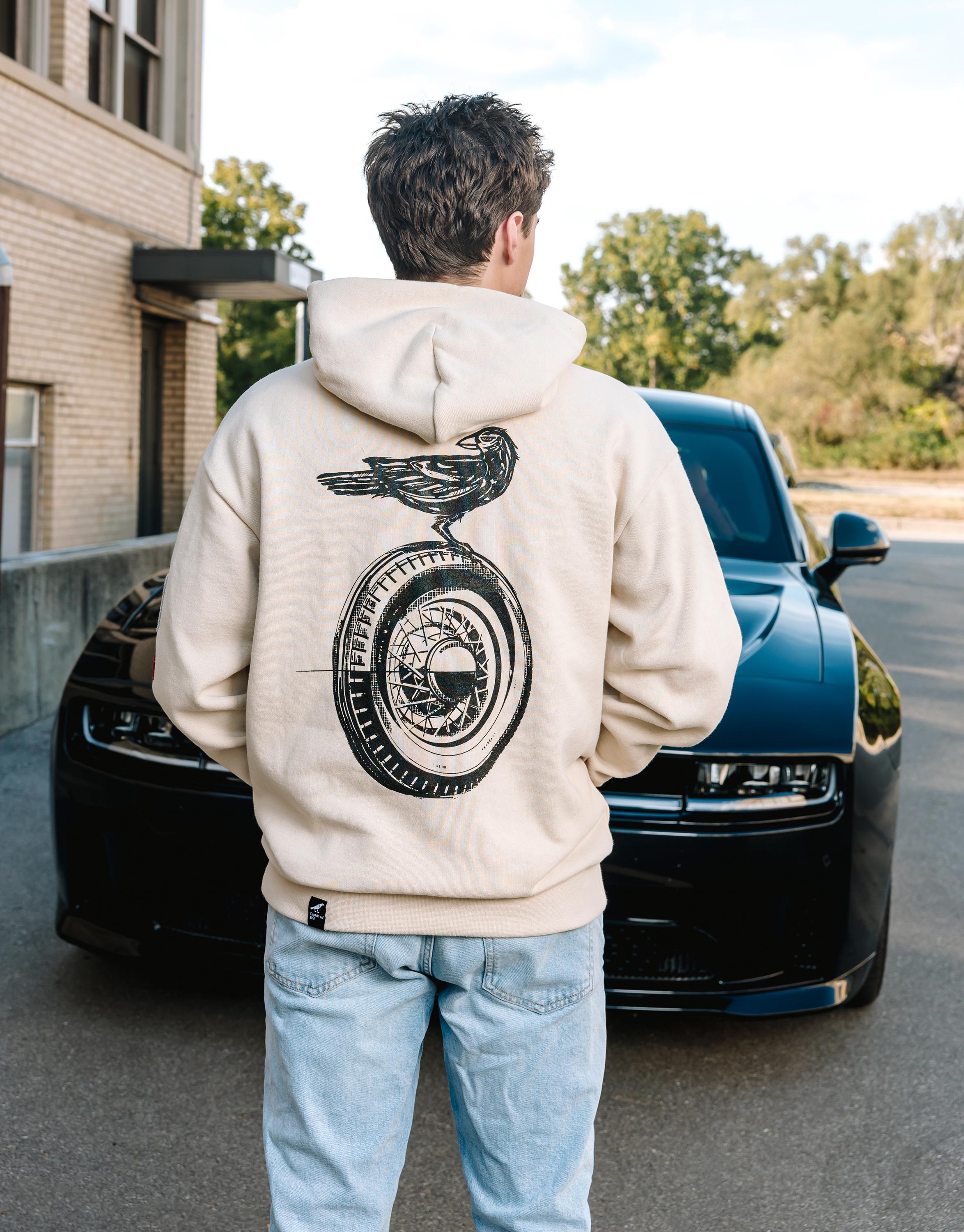 Be ready for fall car meets. Soft and oversized unisex off white colored hoodie with silkscreened crow/wheel graphic on the back. Vintage patches hand selected and sewn on sleeve therefore making each hoodie unique and special.