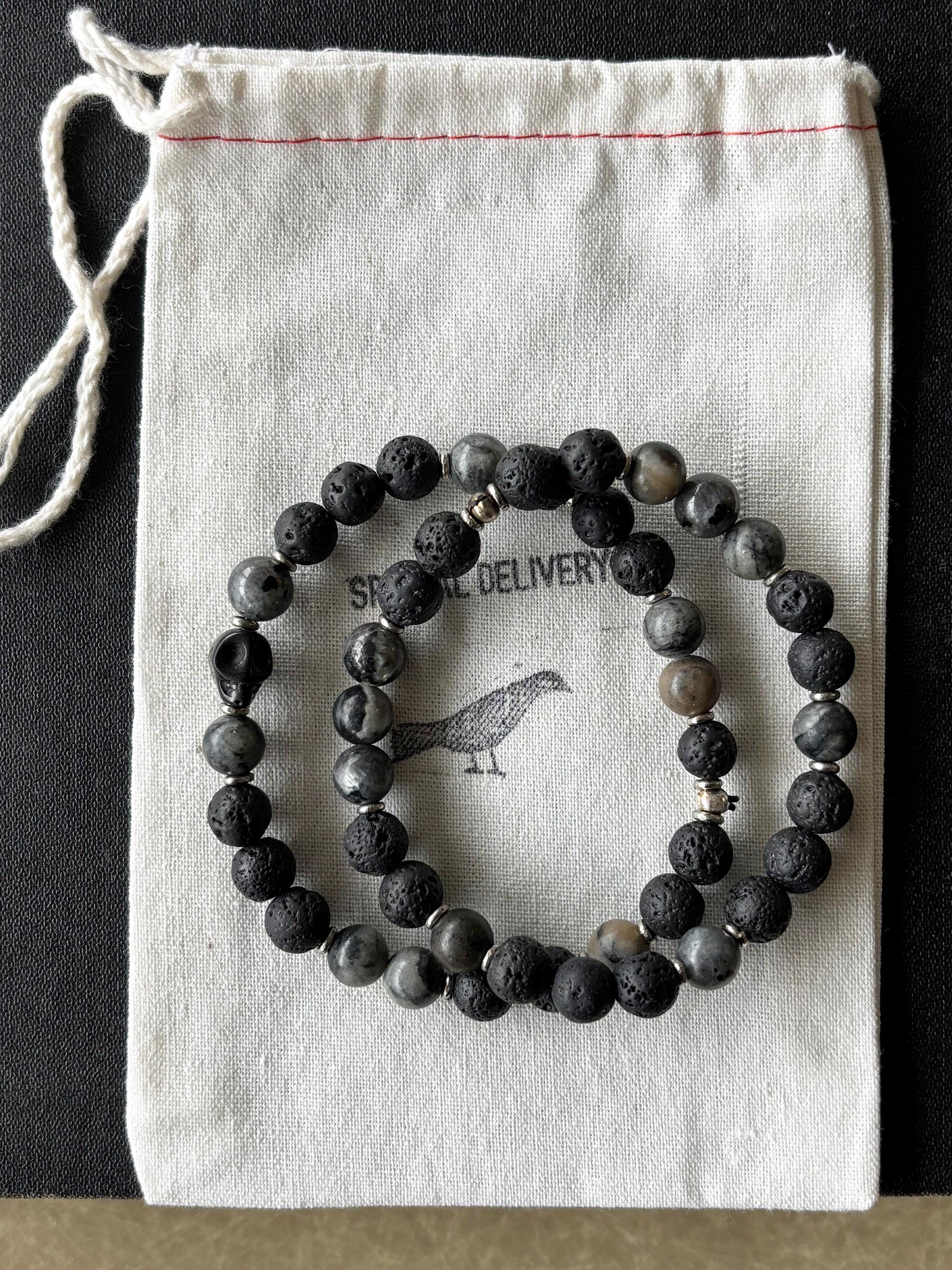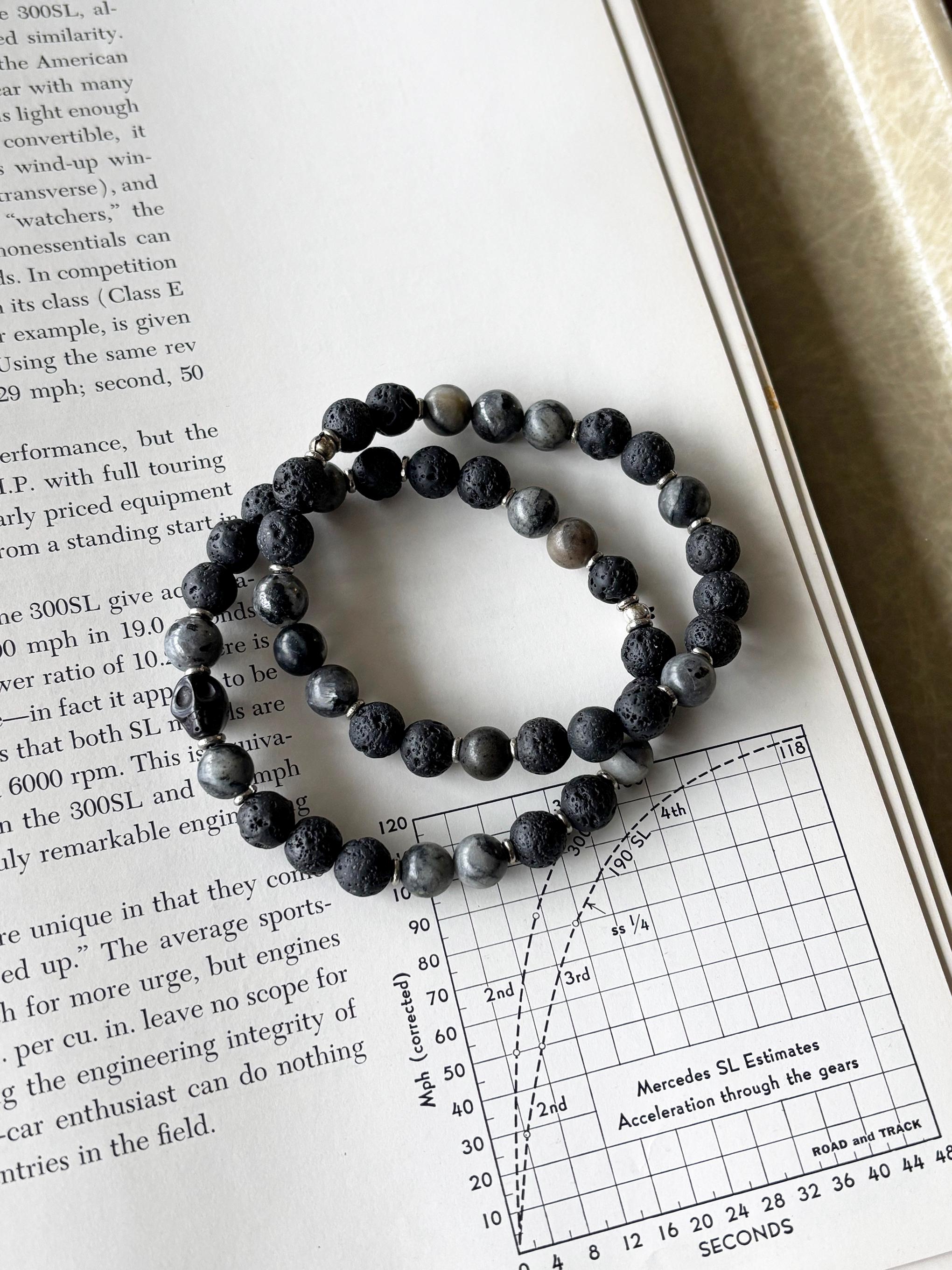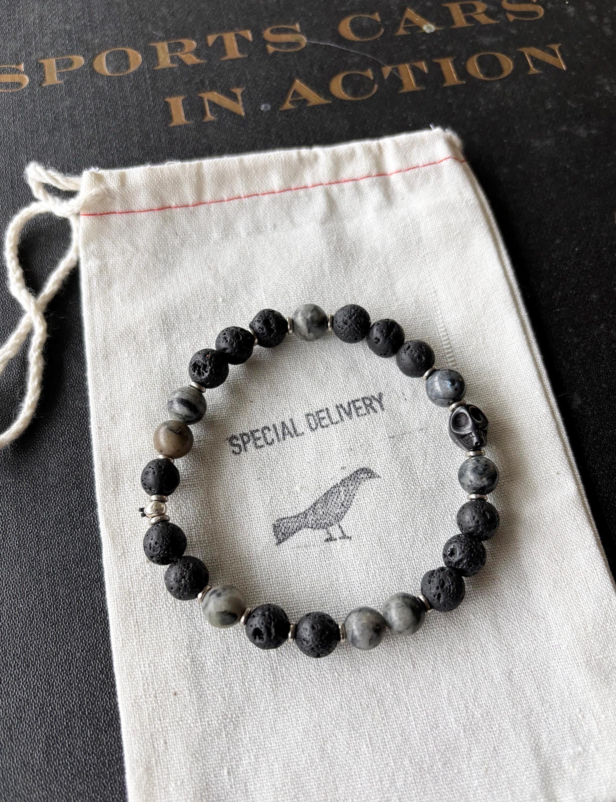 Unisex Moto beaded bracelet comprised of natural black lava rock and dark gray jasper beads. Made of black expandable stretch cord. Your choice of with a horn skull bead or without.