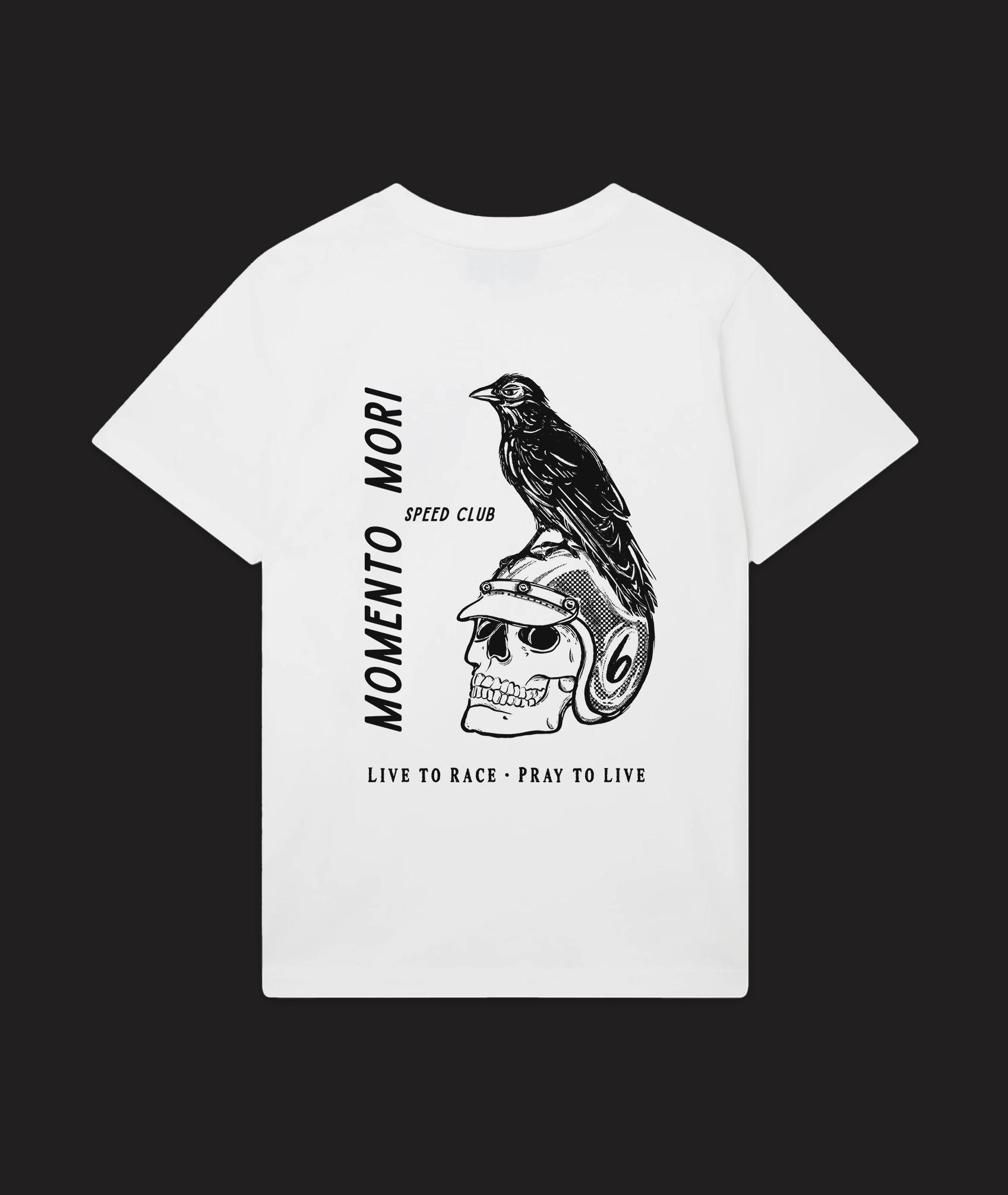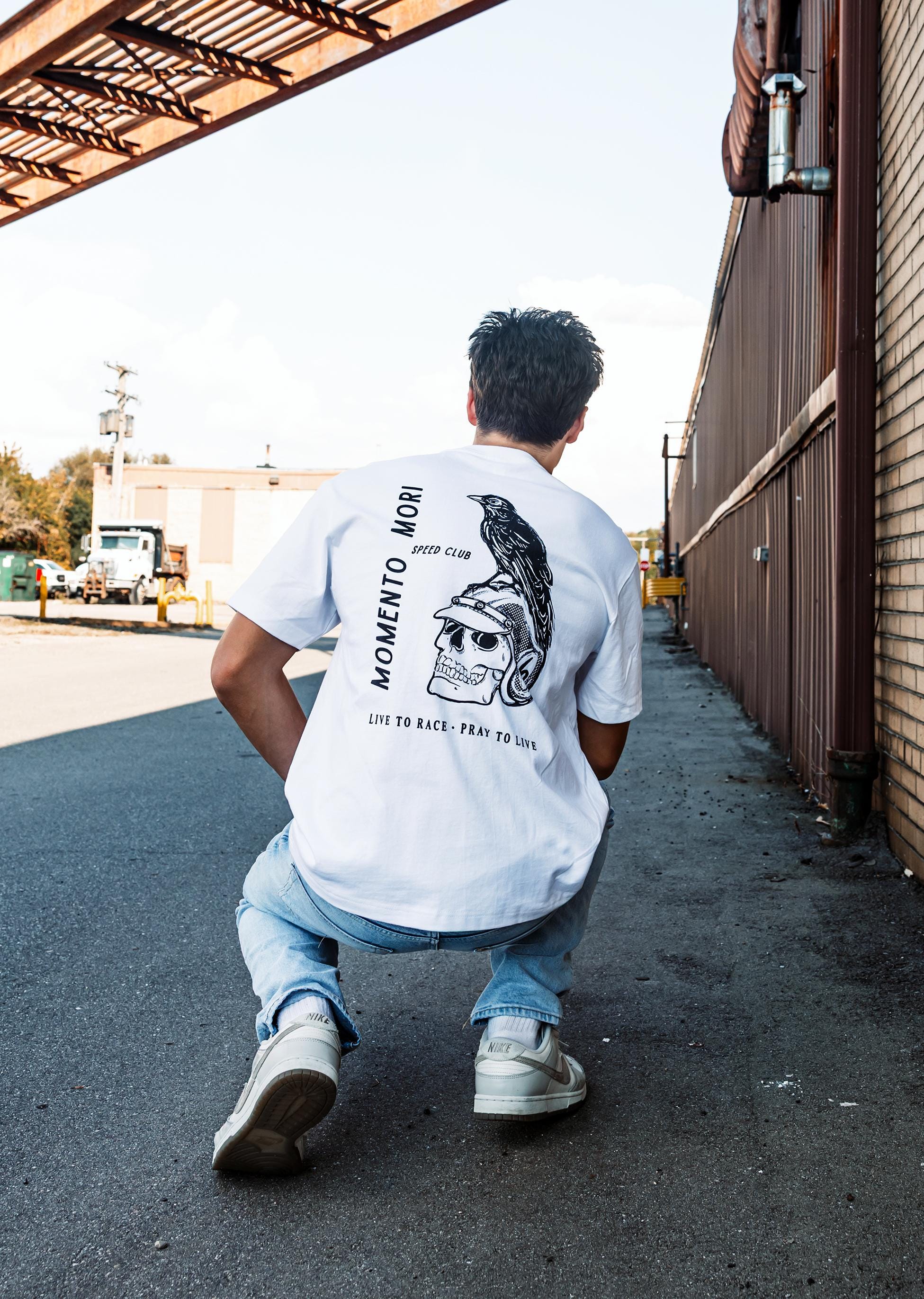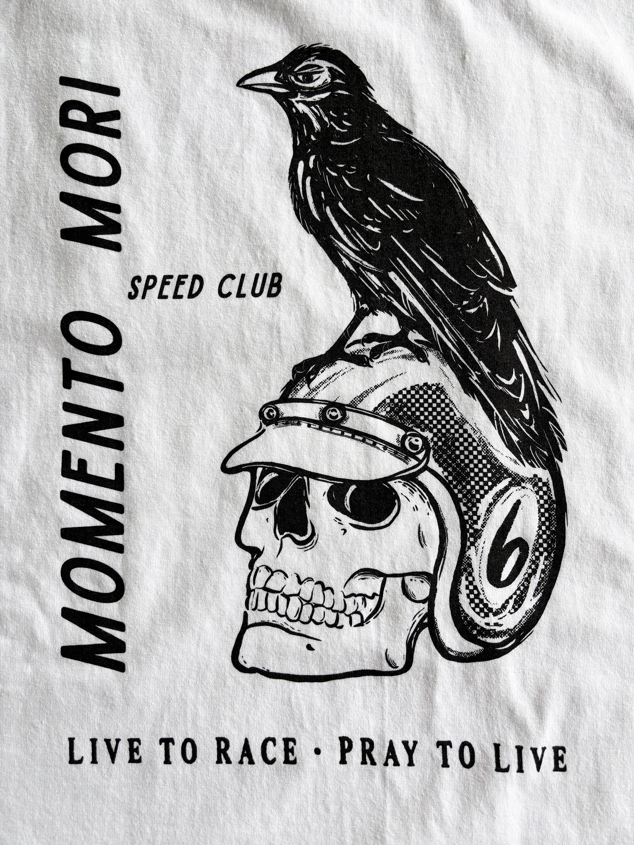Oversized boxy fit Moto Momento Mori Crow unisex silkscreened tee shirt.