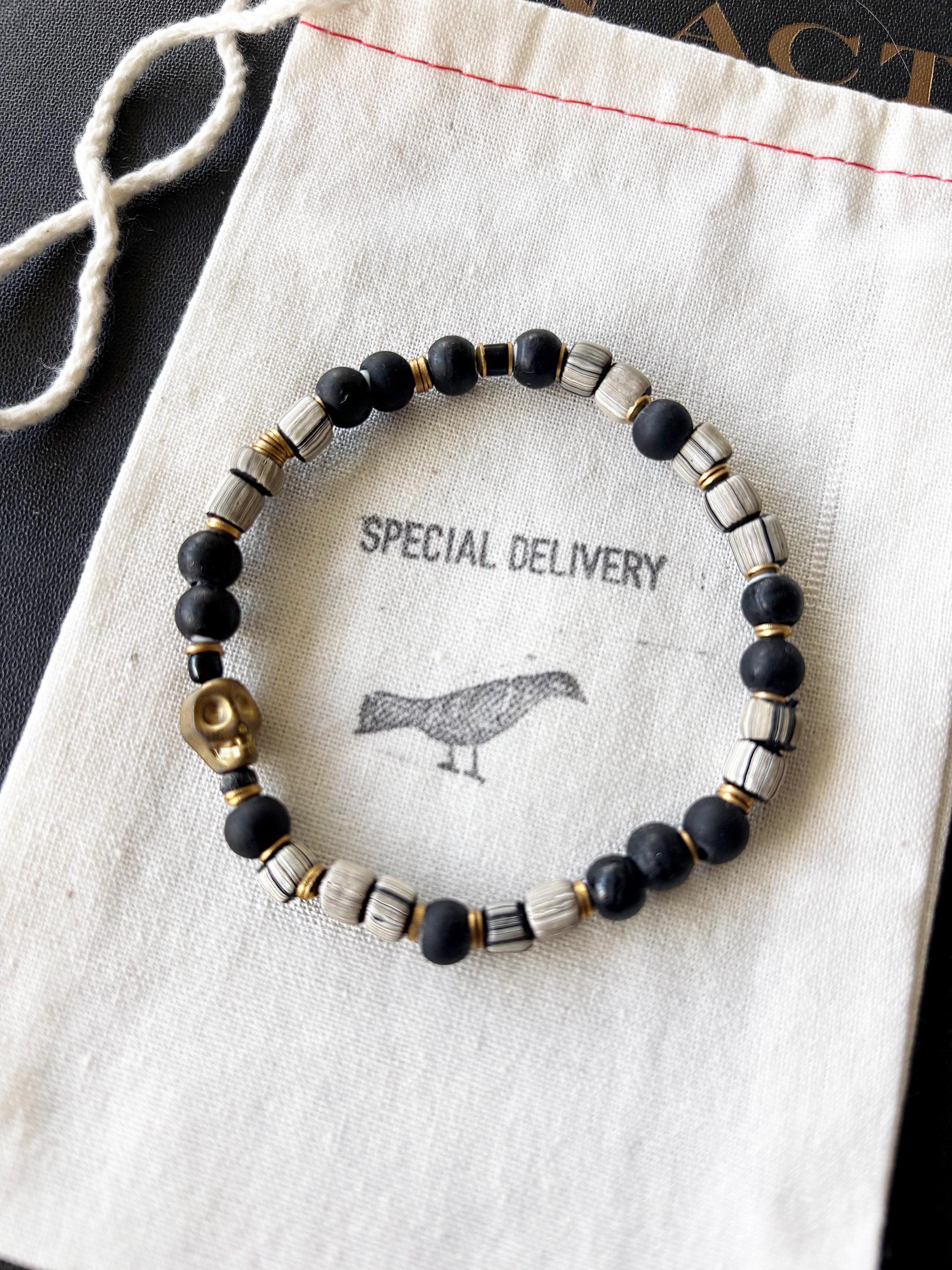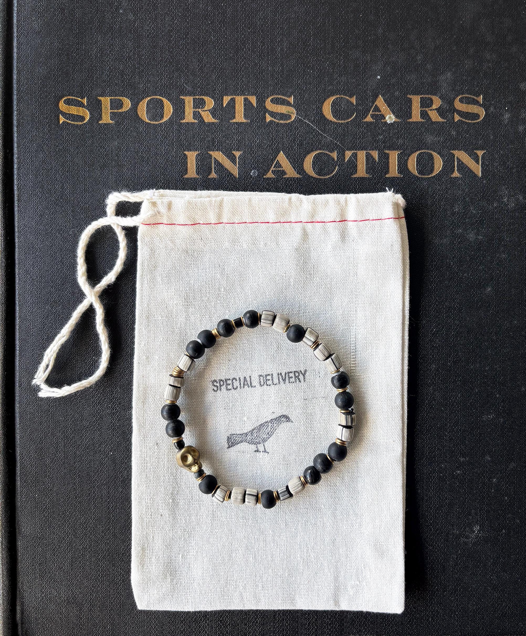 Unisex Moto beaded bracelet comprised of recycled African glass bead striped barrel beads, black glass beads and brass components, including a small brass skull bead. Strung on black expandable stretch cord.