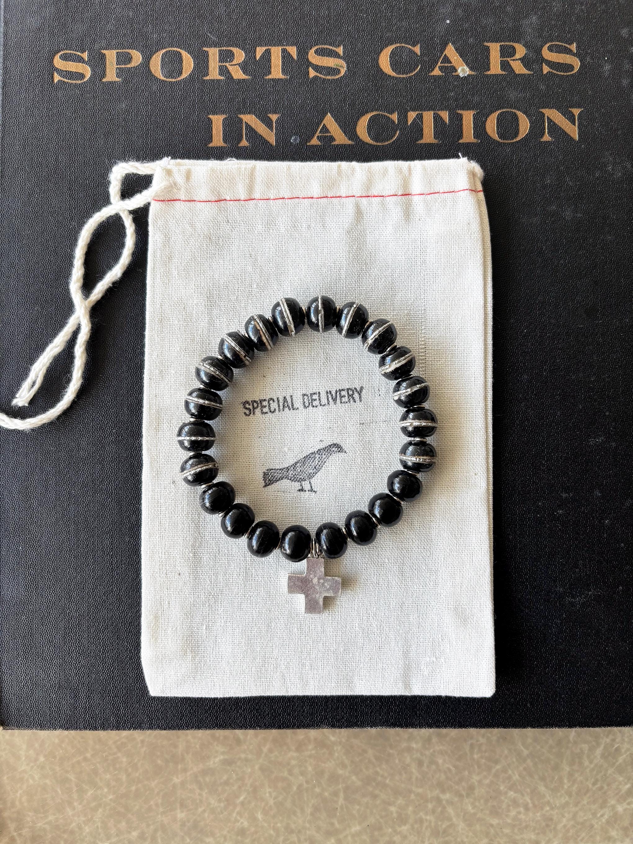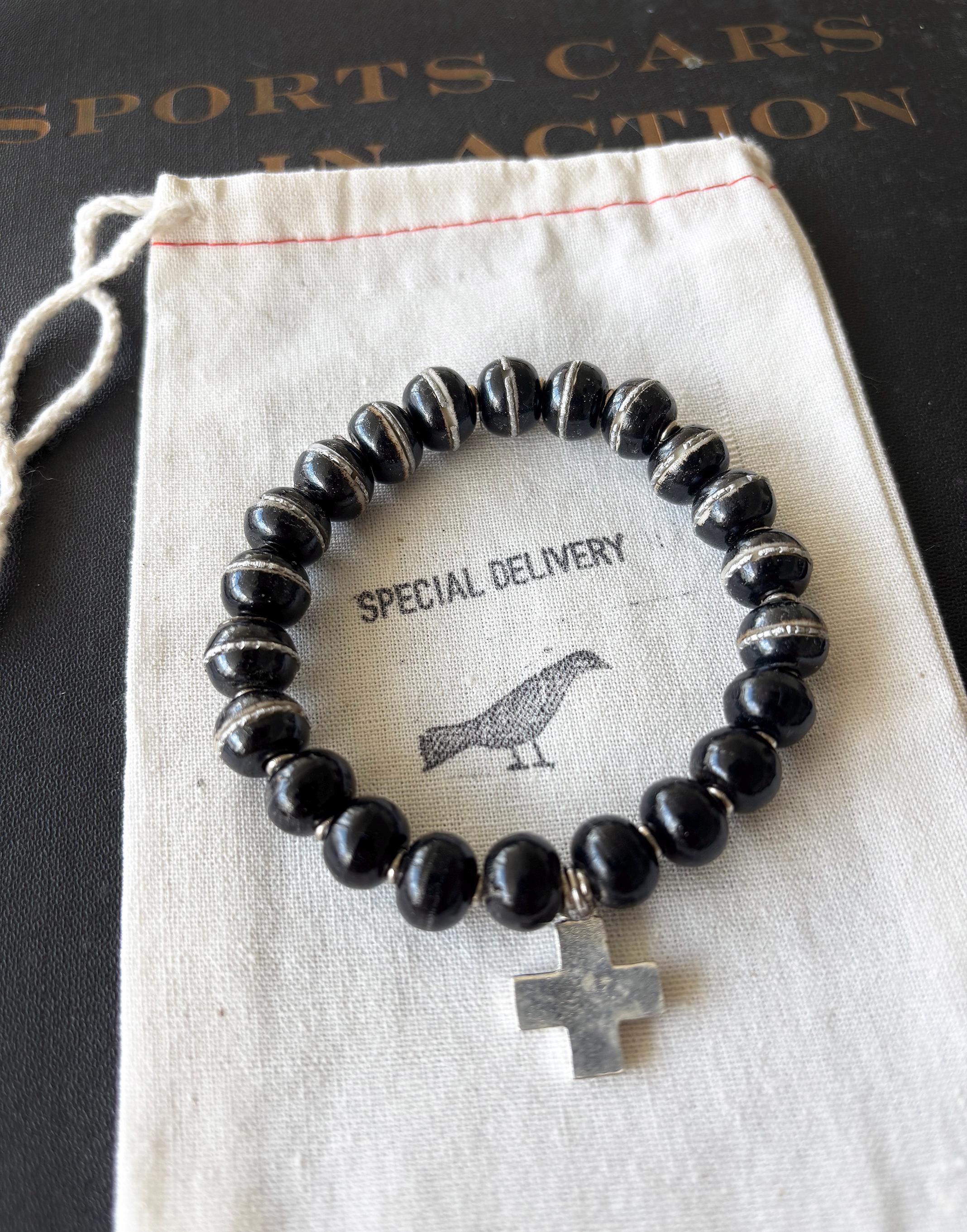 Unisex Moto beaded bracelet comprised of black horn beads with silver accents, including a small silver metal cross. Strung on black expandable stretch cord.